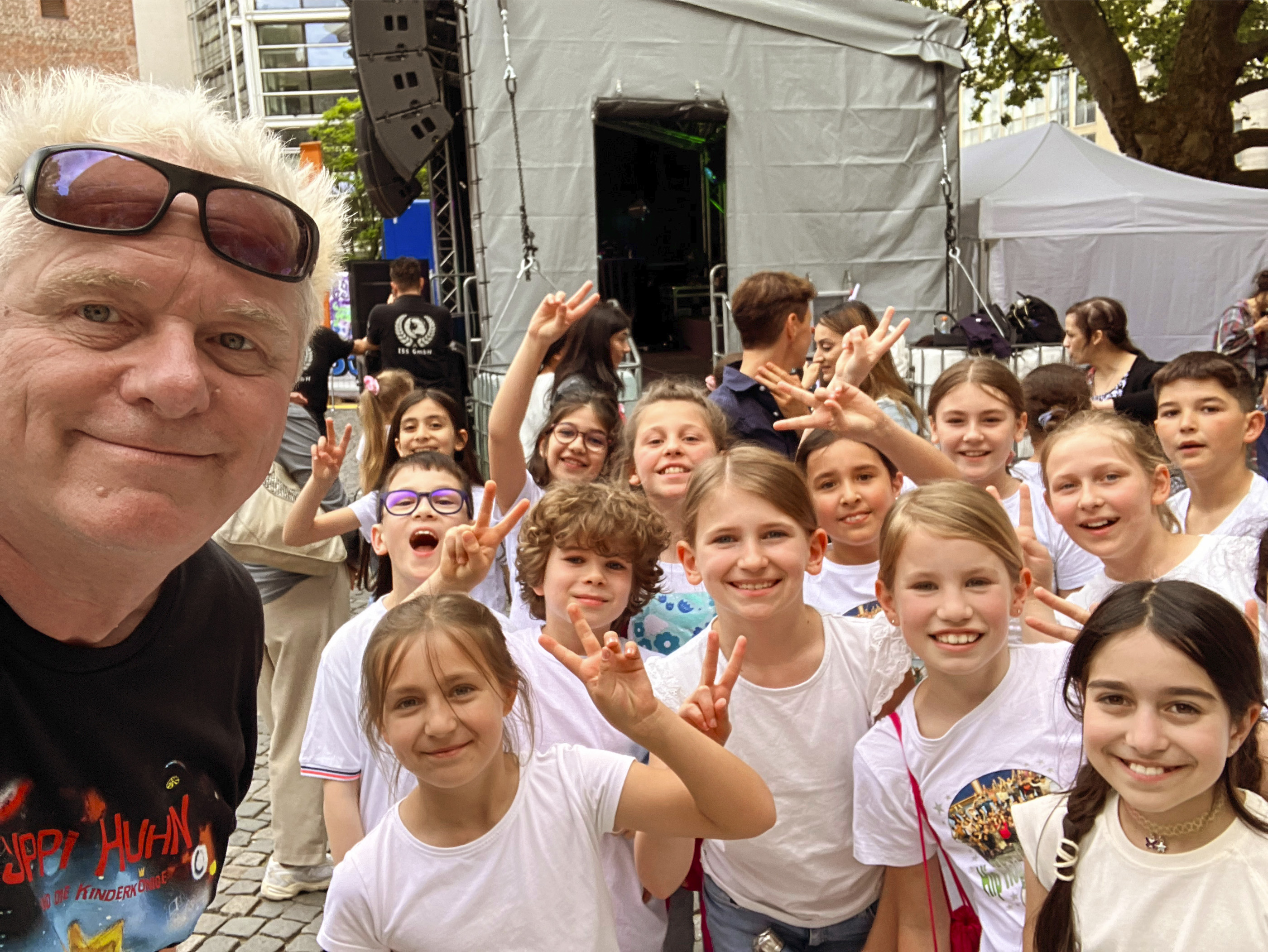 Am Dienstag, den 14. Mai 2024 hatte Suppi Huhn mit den Kinderkönigen des TH an der Großhadener Straße zwei Choreografien eingeübt: Mit den Liedern „Demokratie – wir stehen auf diese Freiheit“ und „Wir öffnen unser Herz“ feierten sie unsere Demokratie, Toleranz, Frieden, Zusammenhalt und Vielfalt. Am Mittwoch, den 15. Mai 2024 haben sie es gemeinsam mit Suppi Huhn auf der Bühne am Rindermarkt in der Münchner Innenstadt vor einem begeisterten Publikum gesungen. Mit diesem Auftritt und vielen weiteren Aktionen in der Münchner Innenstadt wurde daran erinnert, dass das Grundgesetzes am 23. Mai 1949 unterzeichnet worden ist. Das Foto entstand direkt nach dem Auftritt.