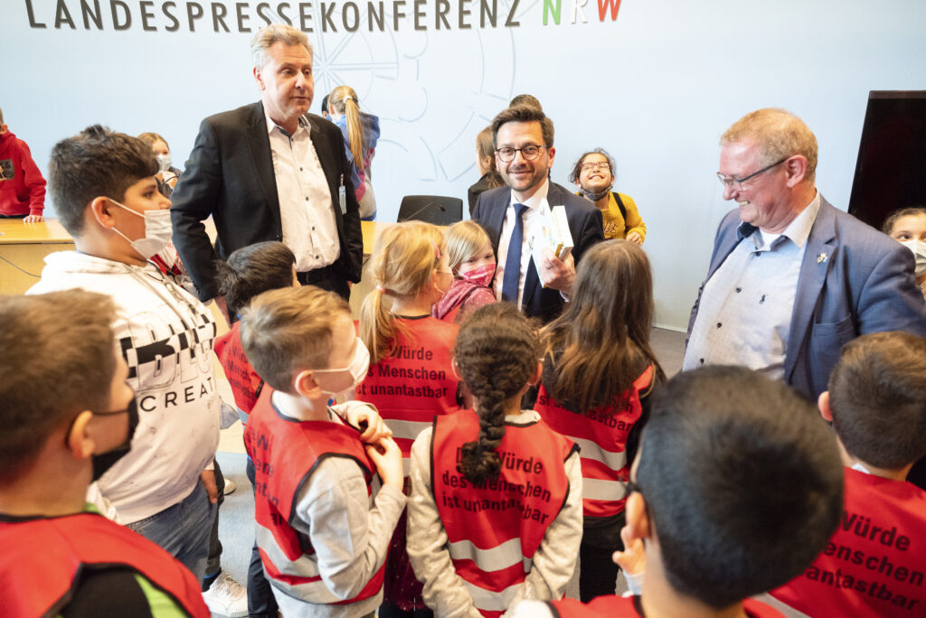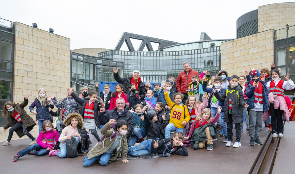 Bereits am Mittwoch, den 6. April 2022 waren Kinder der Maria-Kunigunda-Schule zusammen mit Kindern der Emscherschule, Essen im NRW Landtag und haben gelernt, wie ein Parlament arbeitet. Nach dem Besuch im Sitzungssaal haben die Kinder dem damaligen Vorsitzenden der SPD Fraktion viele Fragen gestellt, die Thomas Kutscharty alle beantwortet hat. Zum Schluss fragte er die Kinder „Wer könnte sich vorstellen mal Berufspolitiker zu werden?“. Daraufhin haben sich mehr als die Hälfte der kinder gemeldet, was die anwesenden Erwachsenen sehr gewundert hat. Das Foto hat Daniel Behmenburg gemacht.