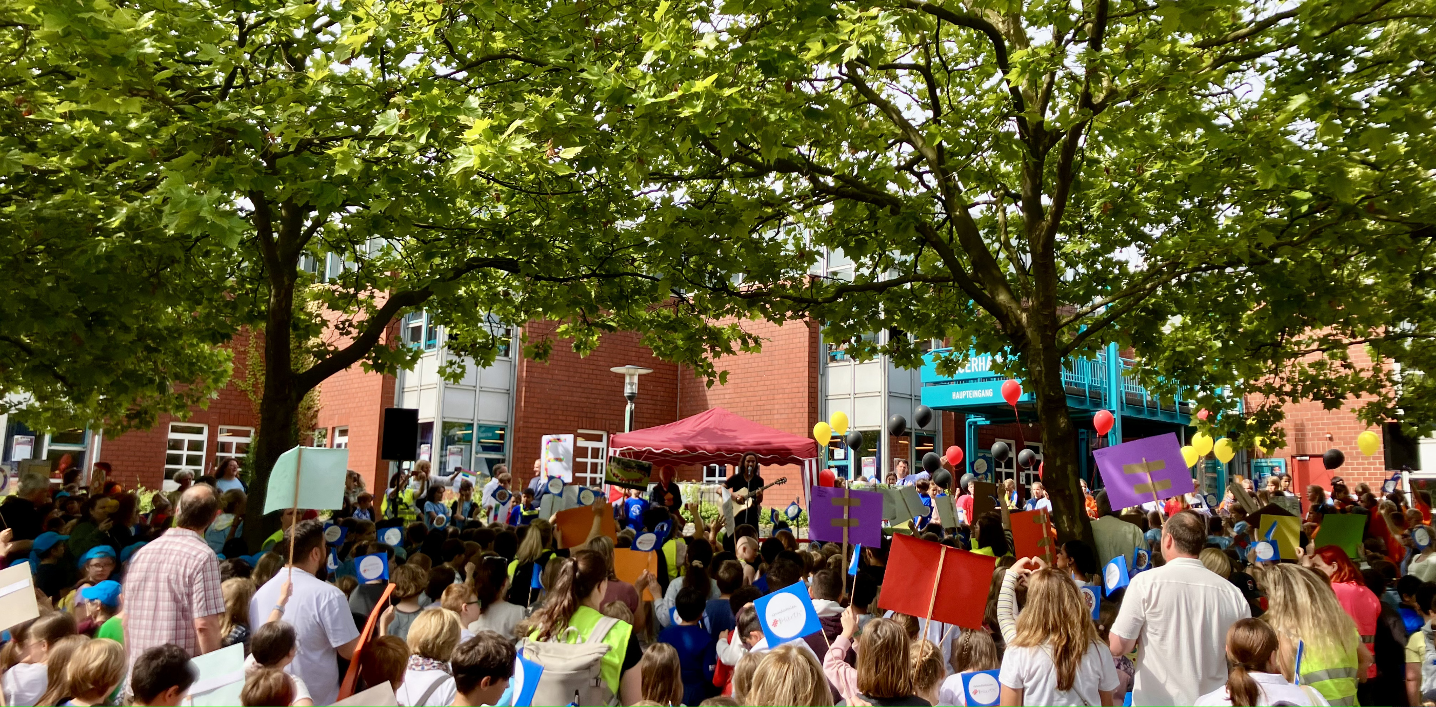 Hier singt Stefan Brings gemeinsam mit allen Hürther Grundschulkindern das wunderbare Lied „Liebe gewinnt“ – ein sehr berührender Moment.
