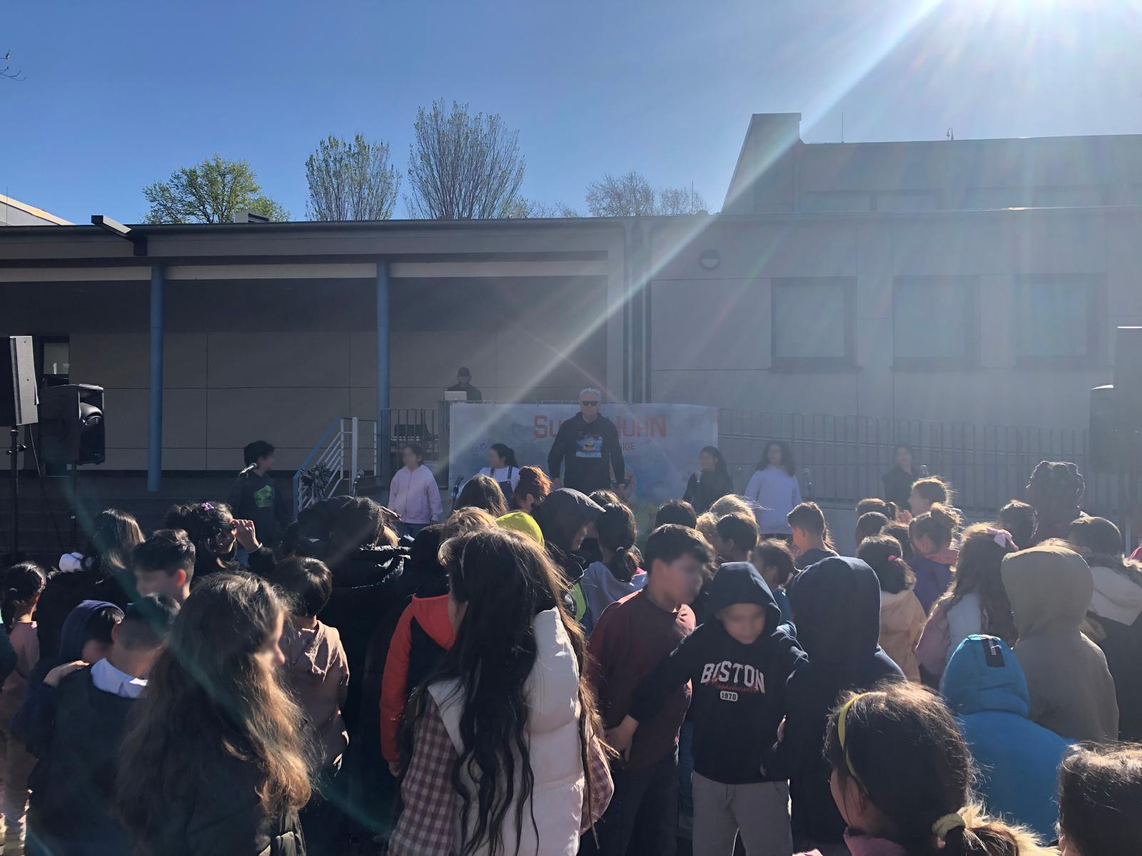 Hier sehen wir Suppi Huhn und die Kinderkönige der Klassen 4 a und 4 b beim Startkonzert auf dem Schulhof.
