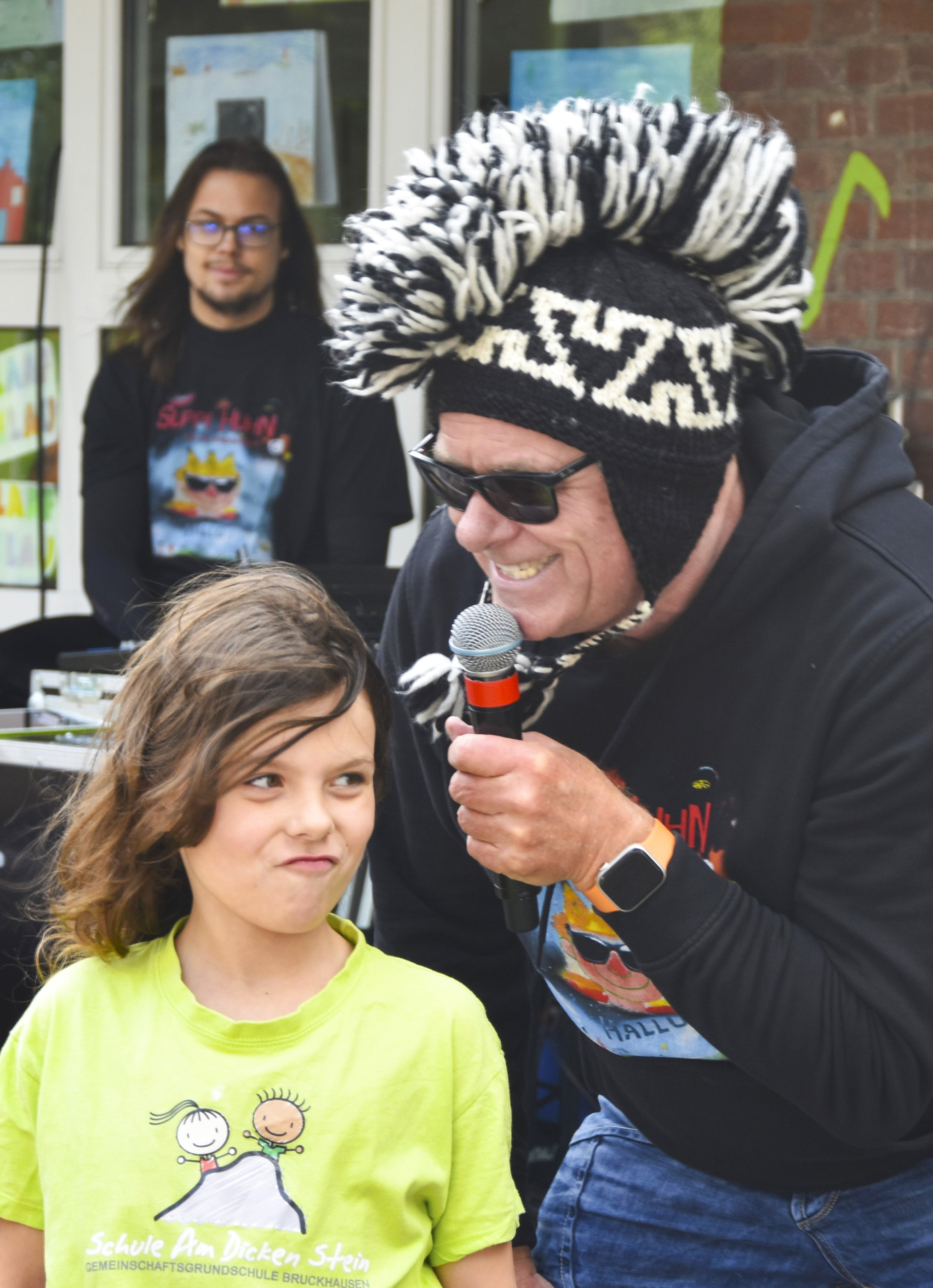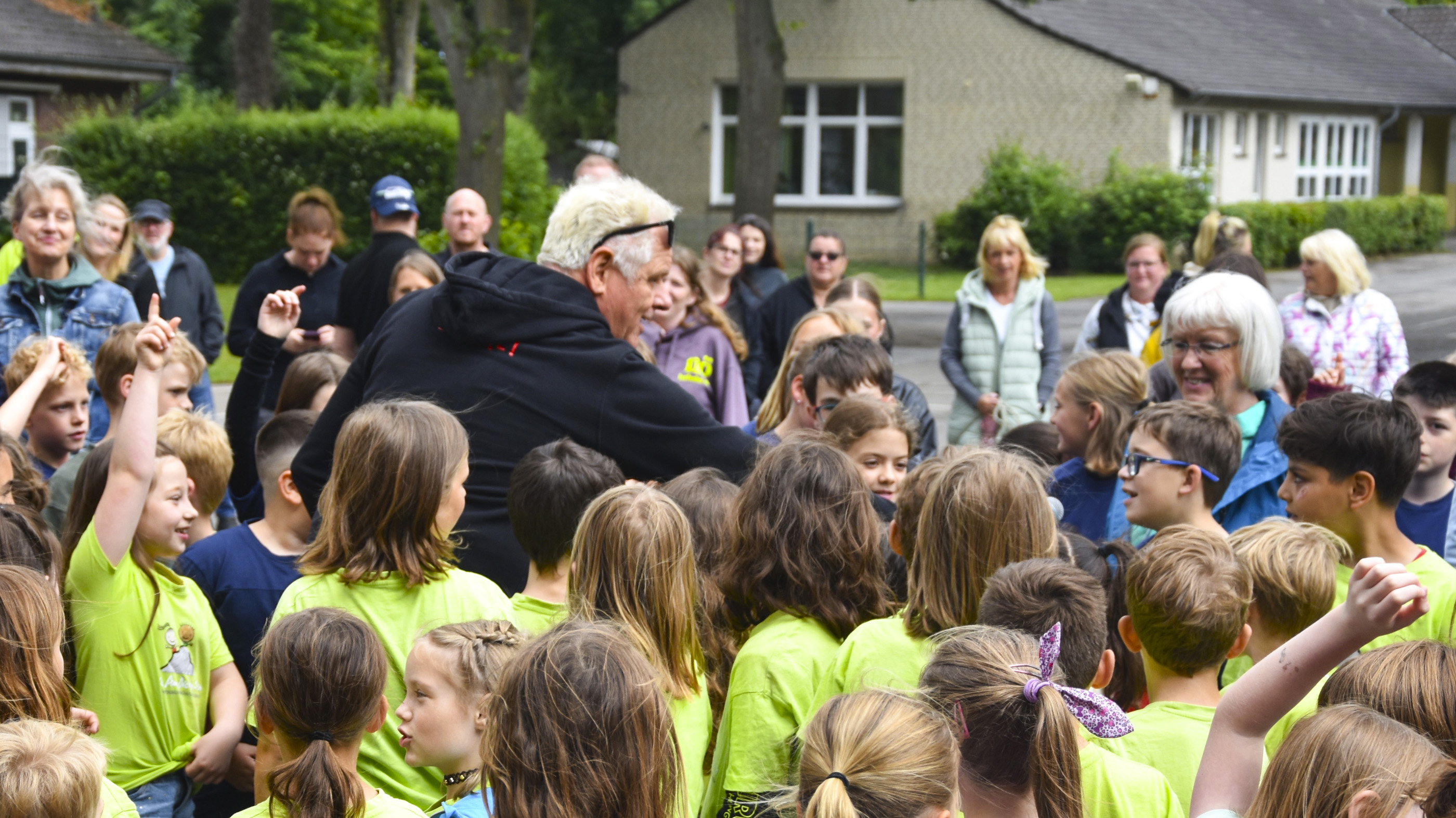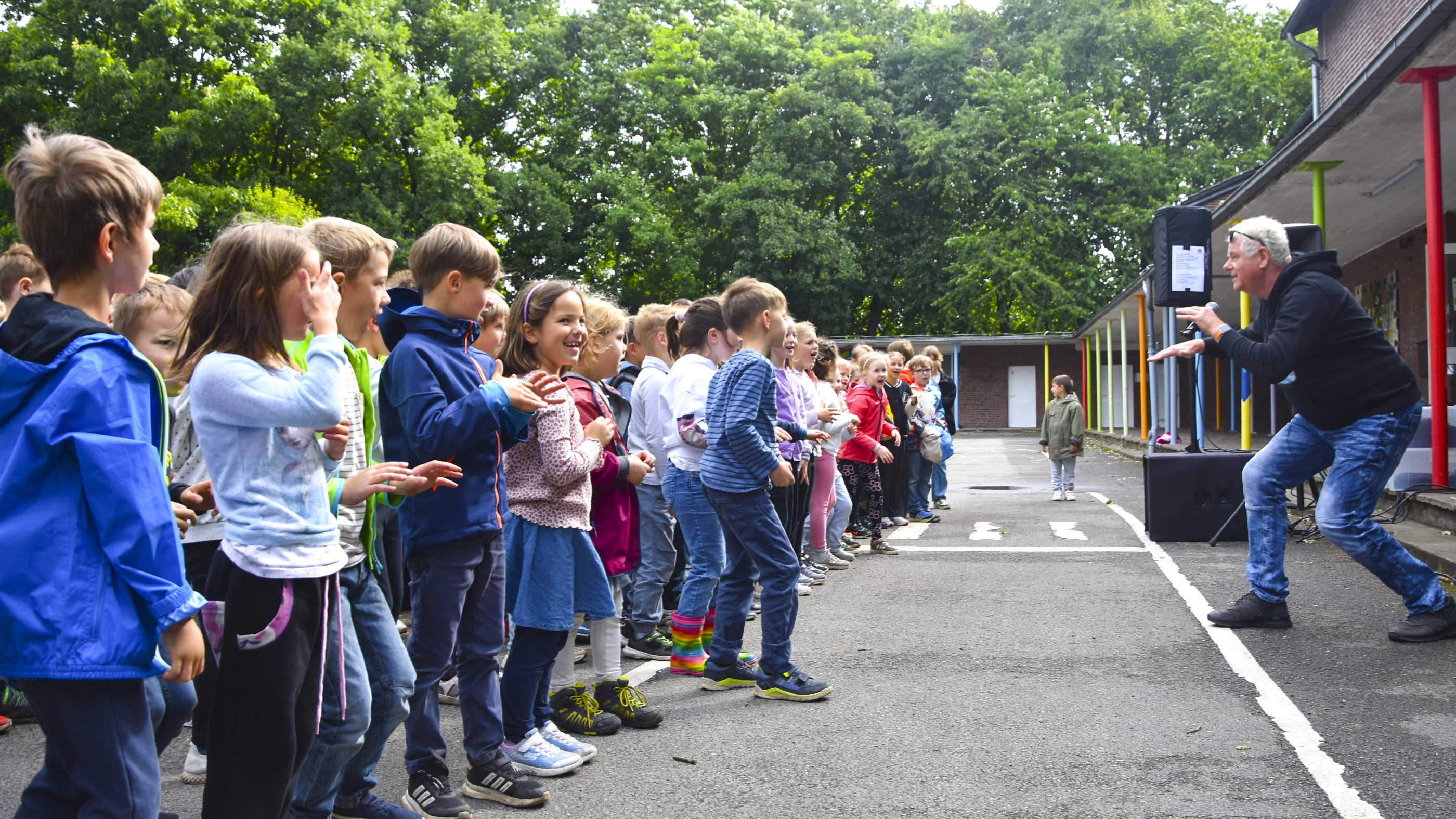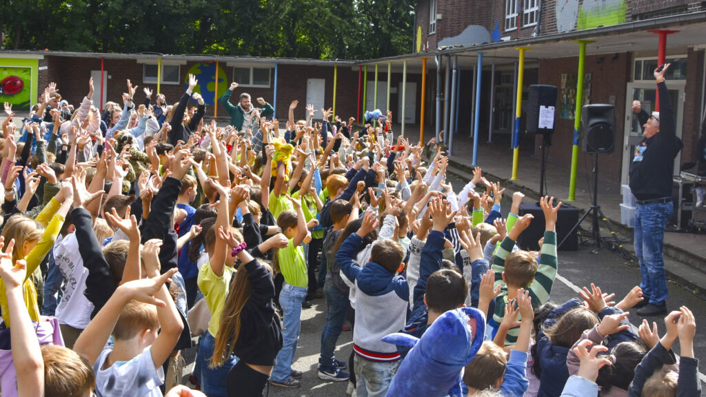 Am Freitag, den 6. Juni 2025 haben die Kinder der Grundschule am Dicken Stein in Hünxe-Bruckhausen mit Suppi Huhn auf dem Schulhof geübt. Dies war ein Konzert zum Kennenlernen der Lieder, zum Reden und zum Abstimmen, welche Lieder beim Abschlusskonzert gesungen werden sollen.