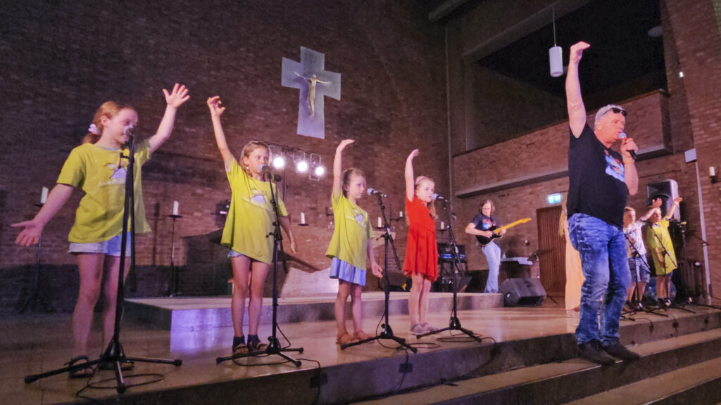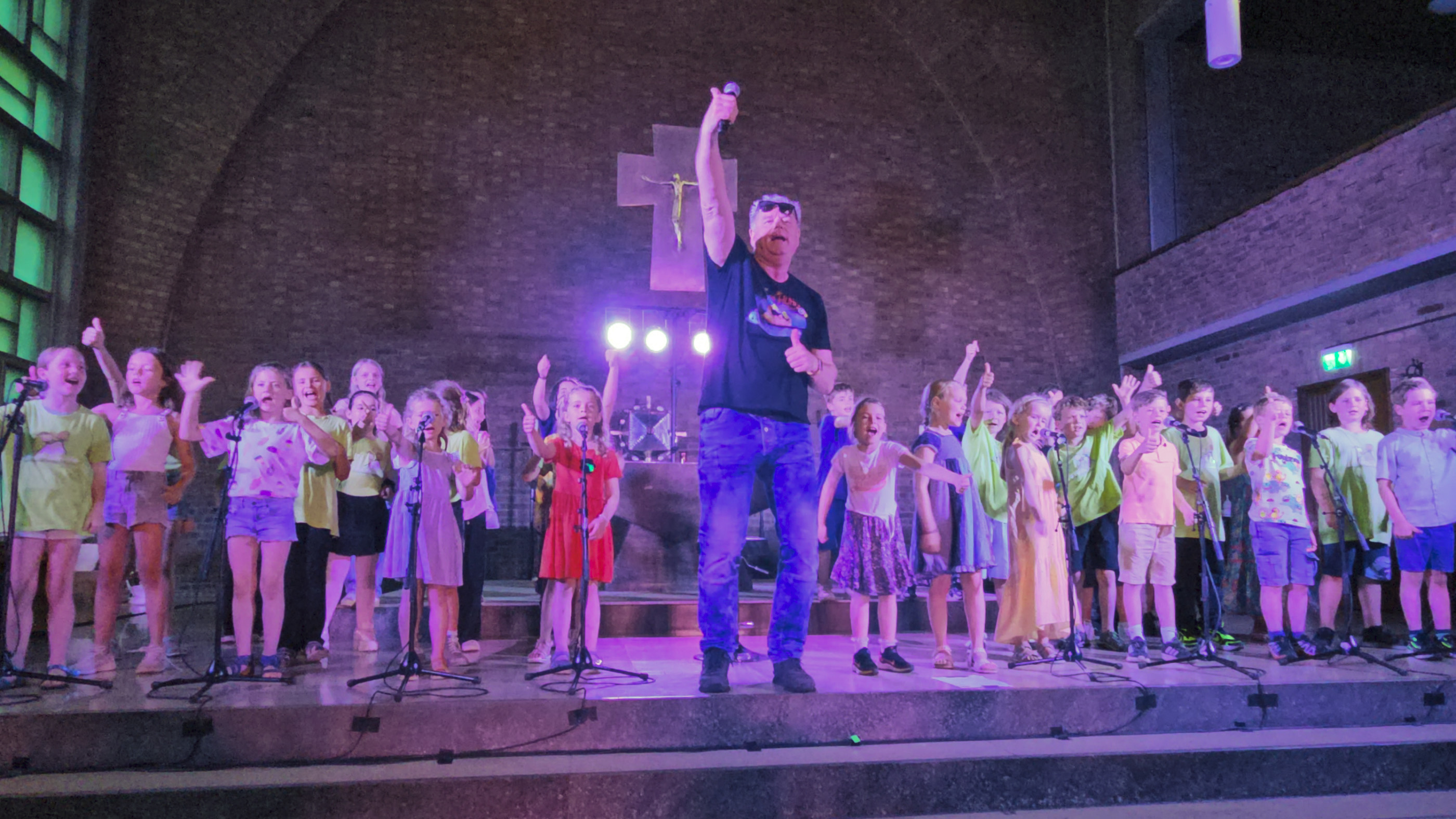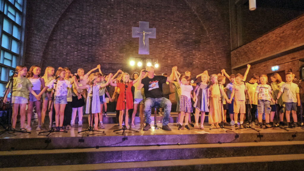 Nach der Probe am 24. Juni 2026 fand am 25. Juni 2026 das große Abschlusskonzert in der Kirche St. Albertus Magnus statt. Für dieses Konzert hatte jede Klasse 2 Kinder gewählt, die die Klasse als Bühnenkind vertreten soll. Hier sehen wir die Gruppe 1 mit dem Lied „Schokoladeneis“ und der Choreografie zur Zeile „In einer Riesentüte“.